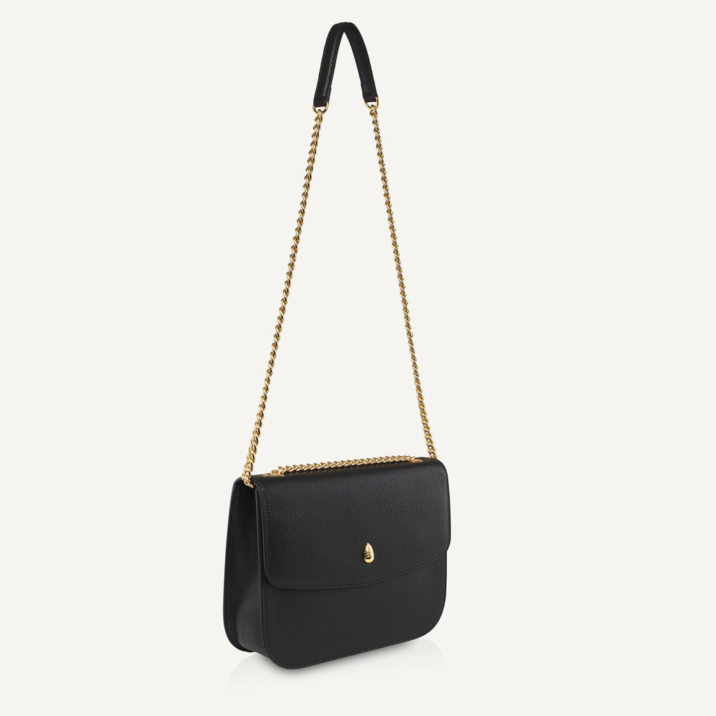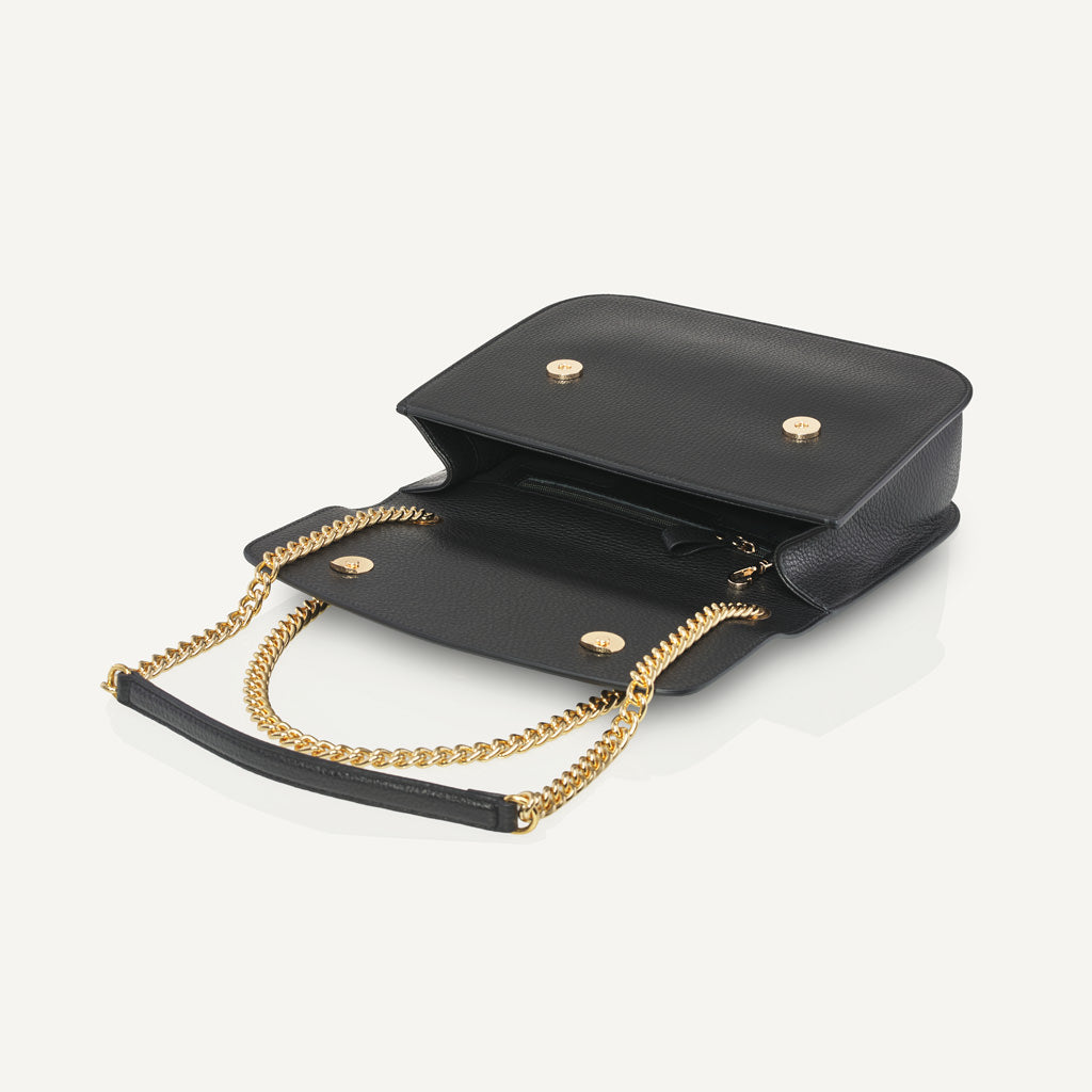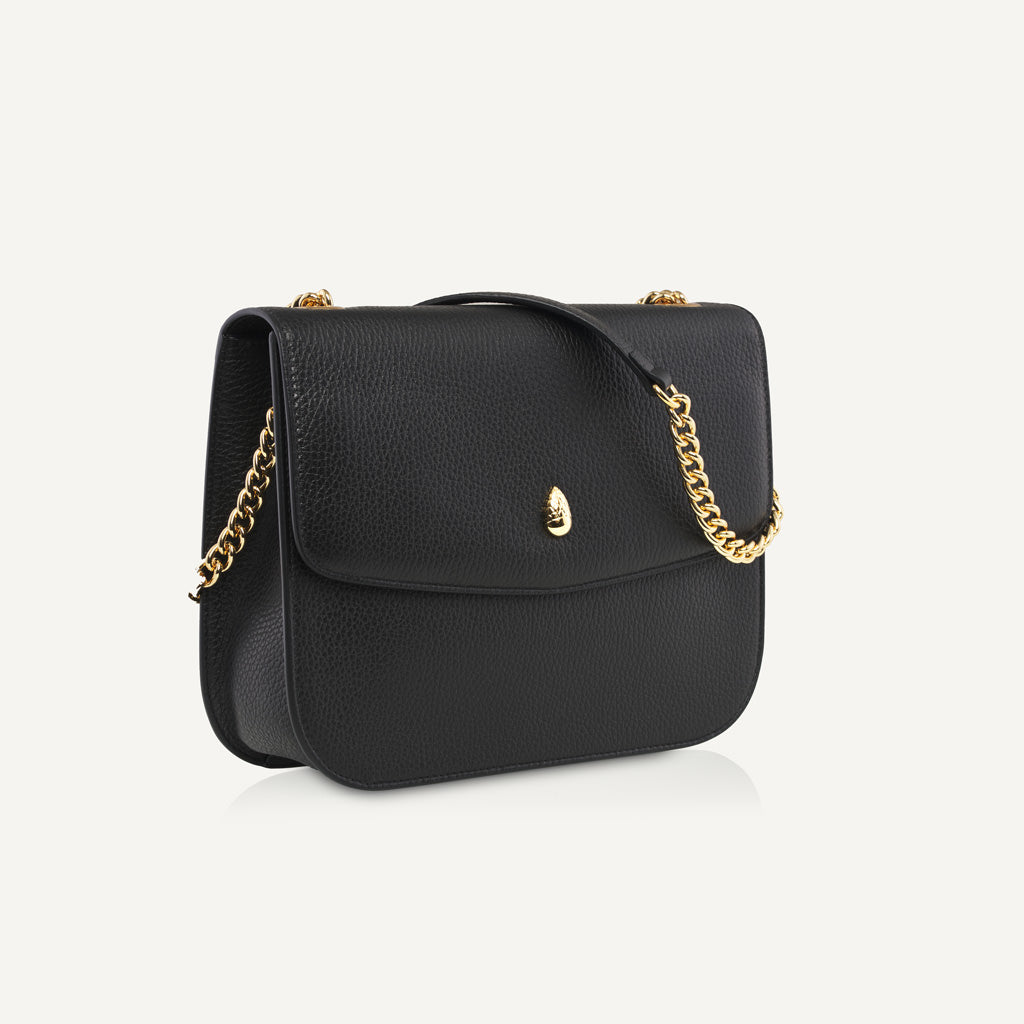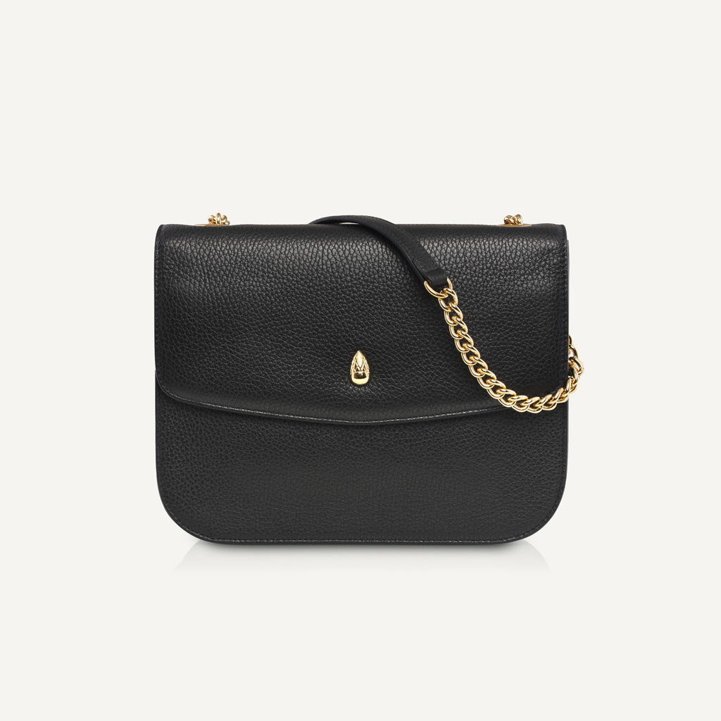 The Grand Dauphin Bag in Black embodies French elegance with a sleek, structured silhouette. Crafted from high-quality leather, its deep black color and polished gold-tone hardware add a luxurious touch to any outfit. It is named in honor of the Grand Dauphin, eldest son of Louis XIV.